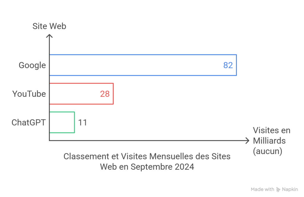 En septembre 2024, ChatGPT se classait onzième site le plus visité au monde, un exploit remarquable pour une plateforme lancée moins de deux ans auparavant. Bien que loin des 82 milliards de visites mensuelles de Google ou des 28 milliards de YouTube, la progression rapide de ChatGPT laisse entrevoir un avenir prometteur.
